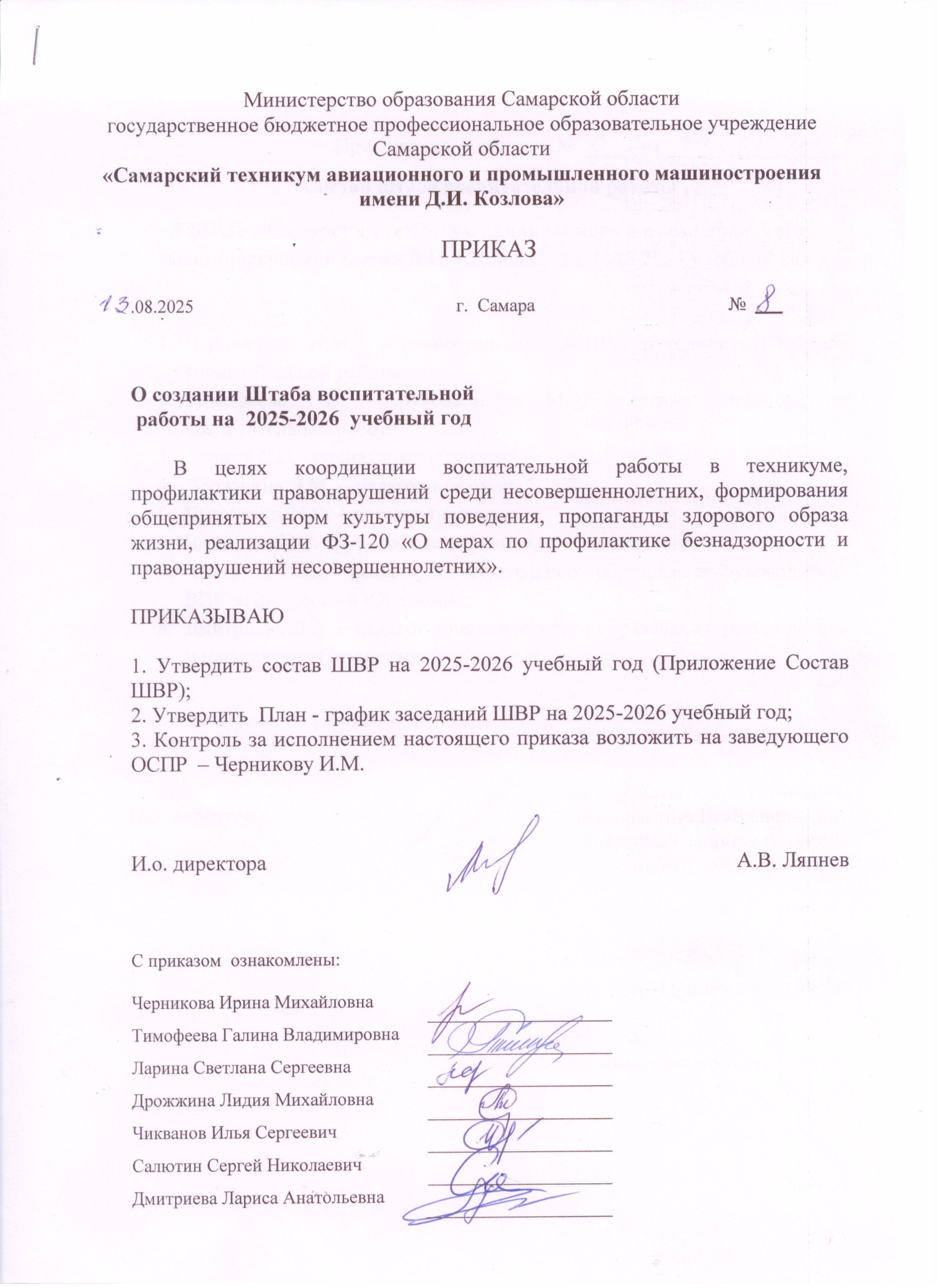 3 ) Приказ о создании Штаба воспитательной работы на 2025-2026 г.